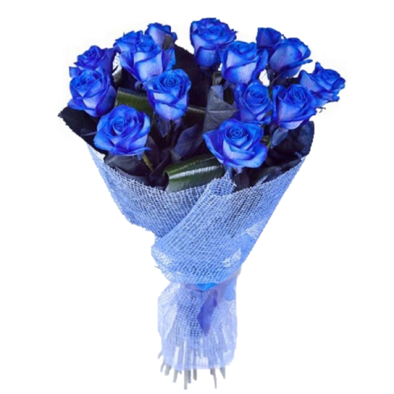 Букет состоит из 15 синих роз, аспидистра, красивая упаковка, атласная лента.