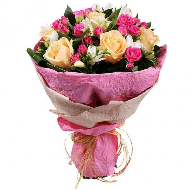 Альстромерия 2 шт., Роза 5 шт., Роза кустовая 4 шт., Фрезия 4 шт. |