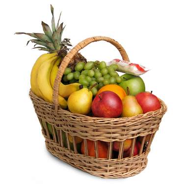 Большая корзина со свежими фруктами. В корзину входит яблоки 6 шт, груши 3 шт, виноград 1 шт, бананы 5 шт, киви 5 шт, апельсины 2 шт, ананас 1 шт, мандарины 5 шт.